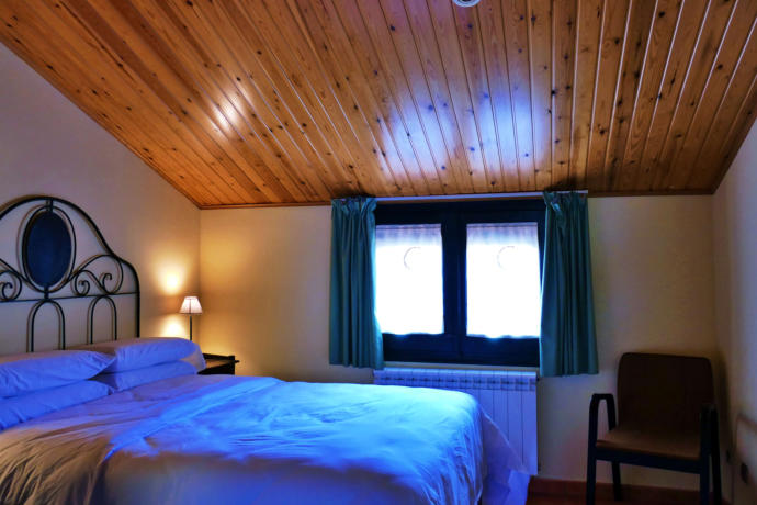 Doubleroomlocatedatthetopofthehouse,under theroof.Decoratedwithwarmcolors,thesloping woodenceilingandtheoldironheadgiveitthe charmofoldtimes.FromthewindowonCarrer NoudelPontyoucanseethedomeofthebell tower.It has a spacious bathroom with glazed shower.The daily breakfast is included in the price.